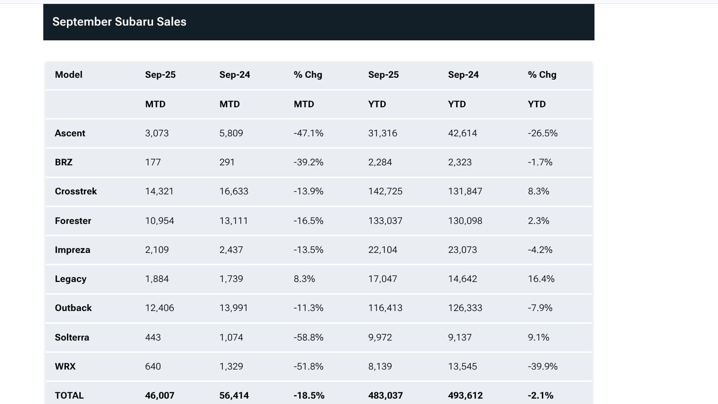 Los clientes adquirieron 1.884 unidades del Legacy el mes pasado, un aumento de 8,3% respecto al año anterior y es el único punto positivo de un septiembre desalentador.